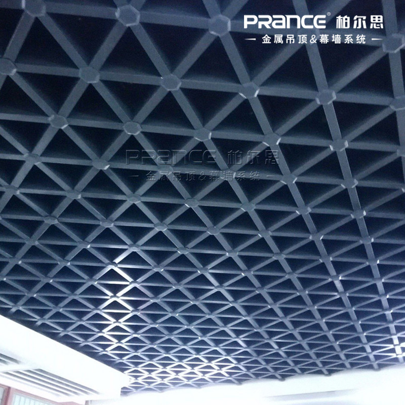 第二種為鋁型材三角格柵吊頂系統(tǒng)主要有鋁通、鋁柱及鋁蓋三部分組成,組裝款式有三角型和六角型。鋁型材三角格柵的型材方通的厚度一般為0.8mm、0.9mm、1.0mm,方通規(guī)格為25*50mm、25*75mm、30*80mm、25*100mm、40*80mm及40*100mm,三角形格子的大小可定制150*150mm、200*200mm、250*250mm、300*300mm、400*400mm、500*500mm、600*600mm及800*800規(guī)格,表面涂層一般選擇粉末靜電噴涂或聚脂漆噴涂,也可選用輥涂、拉絲表面處理。常用顏色為乳白色、黑色,也可根據(jù)要求訂做其它顏色。不同的顏色搭配可以表達出不同的個性特點。